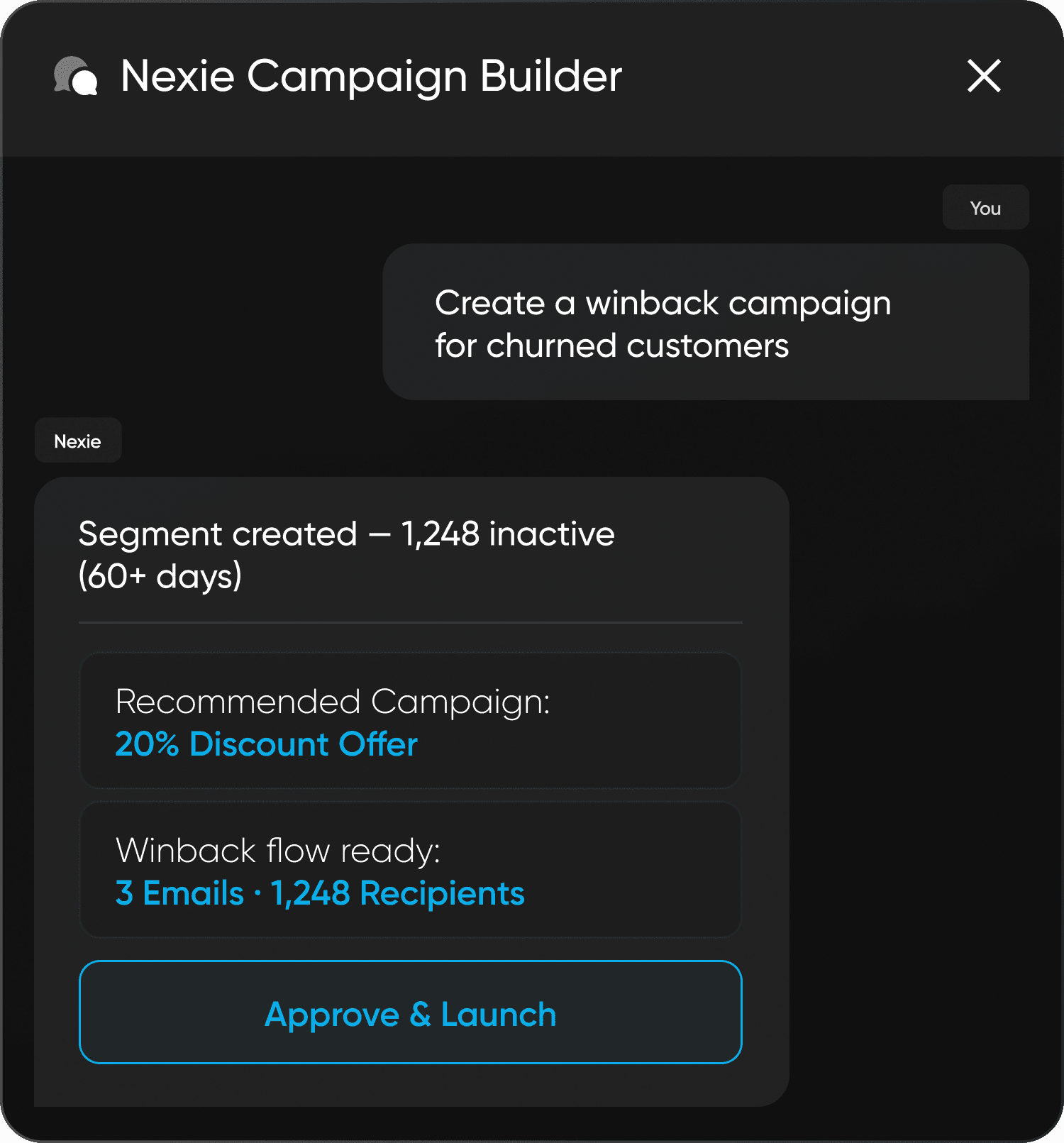 Nexie is your always-on retention marketing agent — it identifies the right customers, crafts personalised campaigns, and launches them autonomously, continuously learning and optimizing to maximize lifetime value.