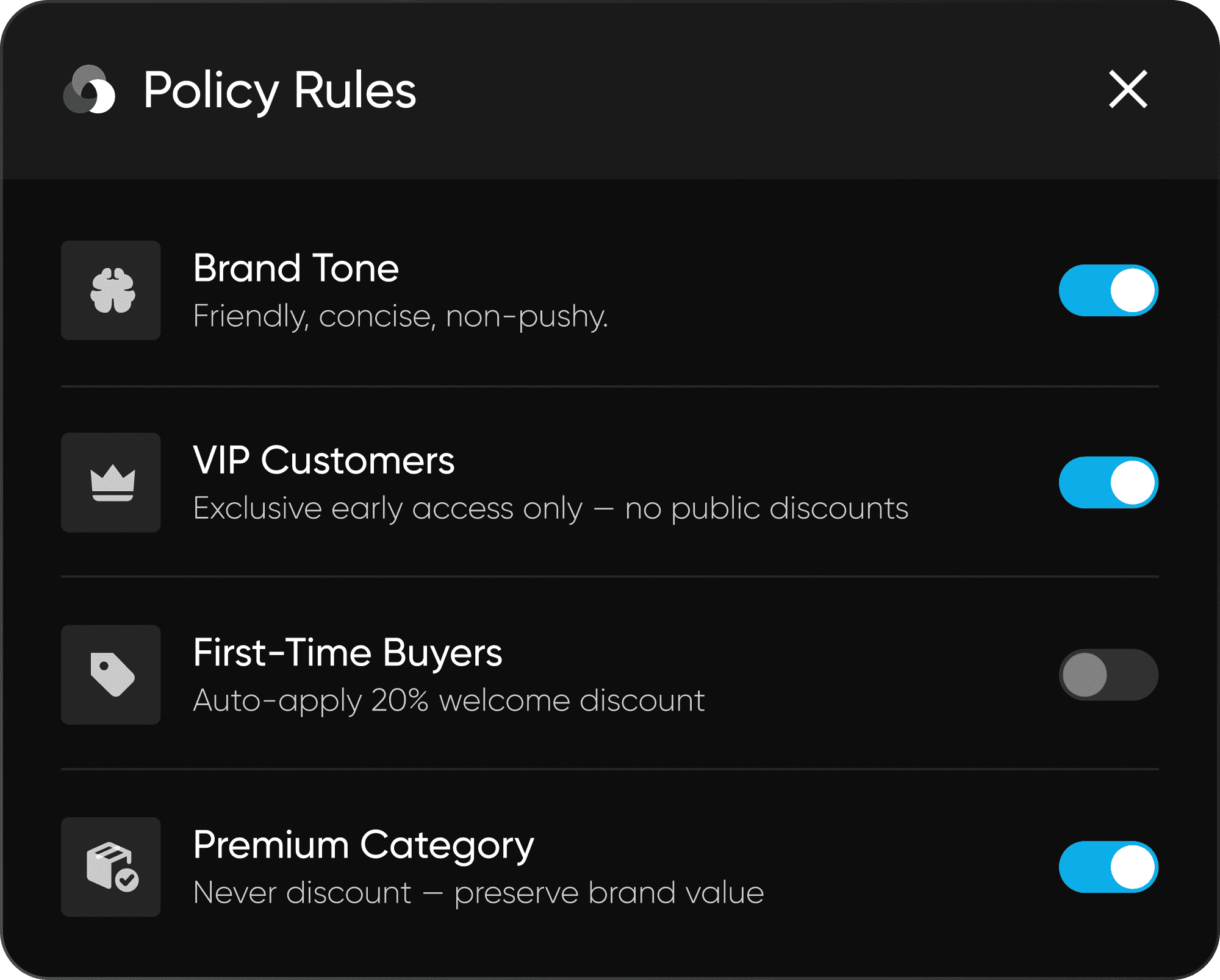 Set your preferences — brand tone, design direction, discount policies, and how each customer segment should be treated — and Nexie follows them automatically.